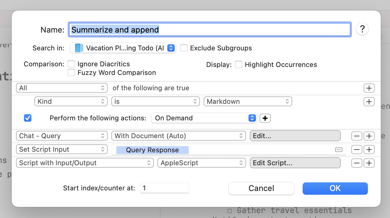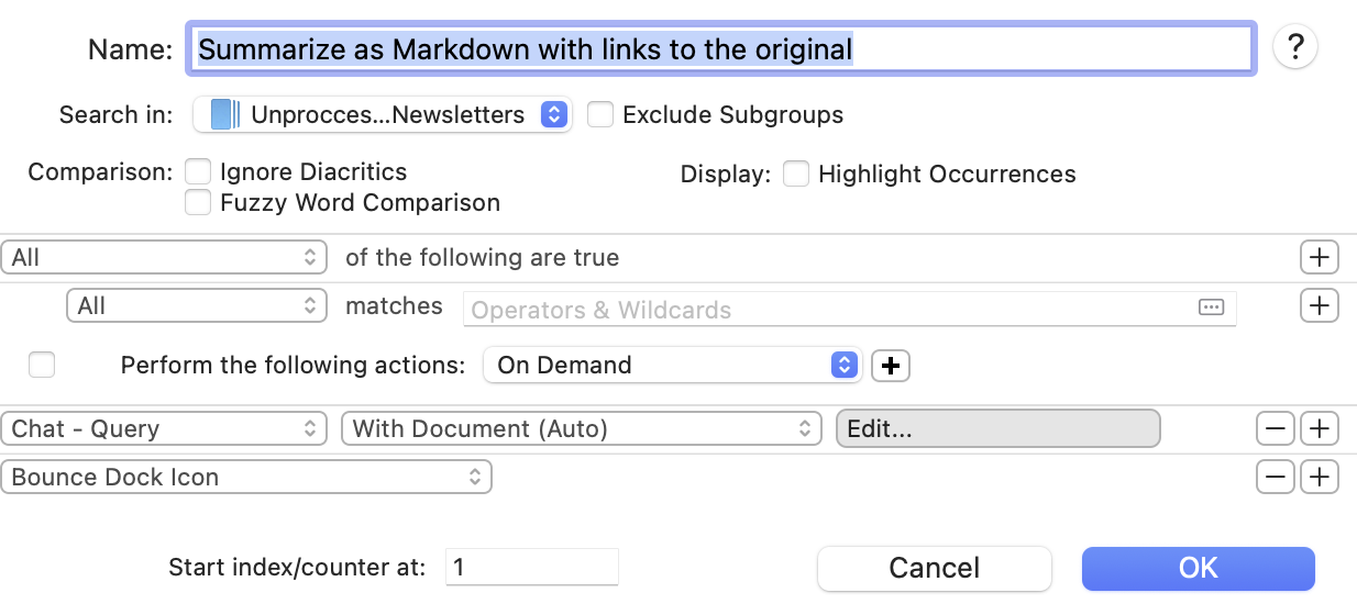 In the continuation of my Weekly Newsletter summarization idea, I would like to create a smart rule that sends a document to an LLM for summarization and then appends the result to a Markdown file.