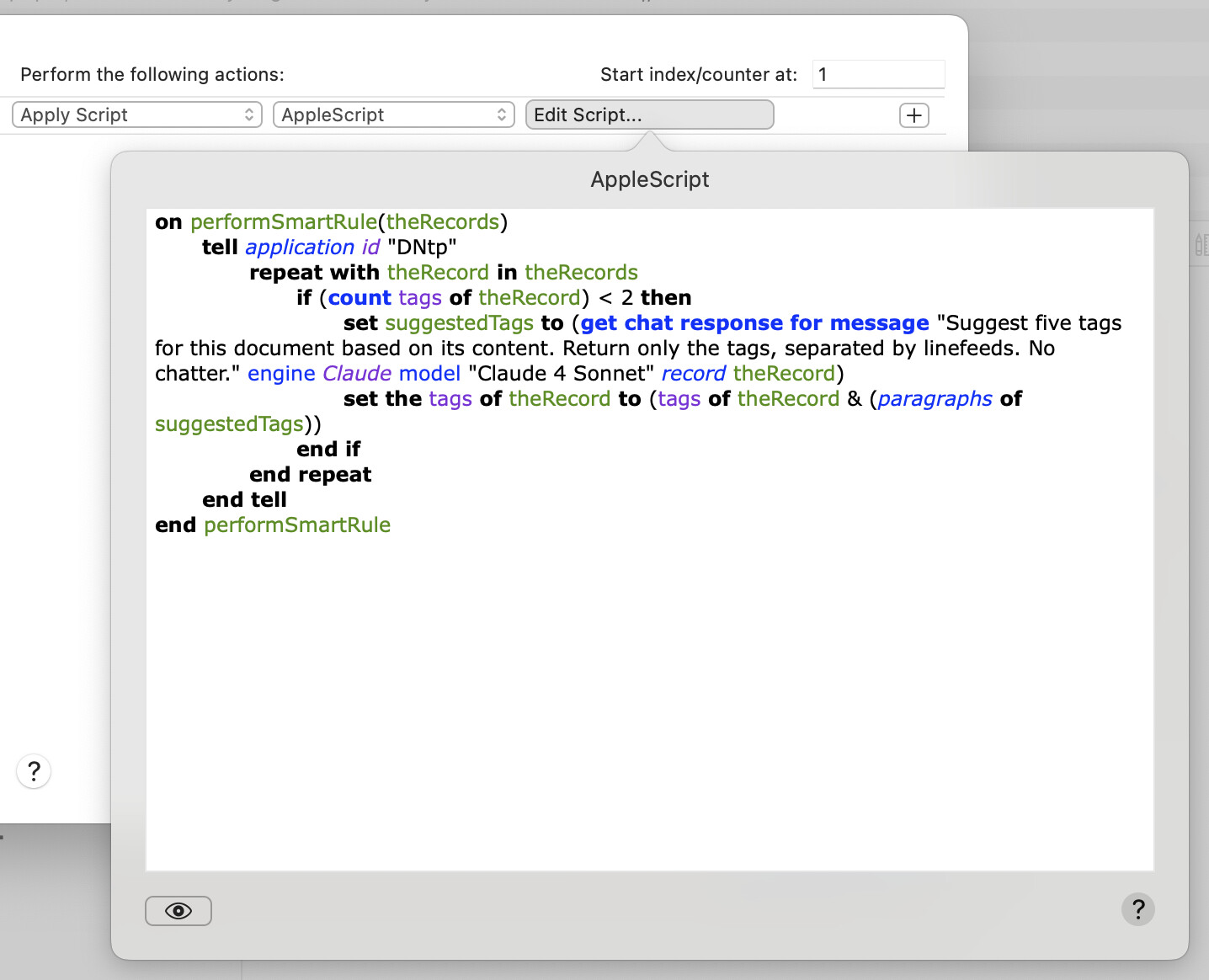 Thanks, that will help. Yeah, I agree that this is right now not completely helpful. Since DT also searches in the text, an AI agent generating tags from the text is offering no additional info.