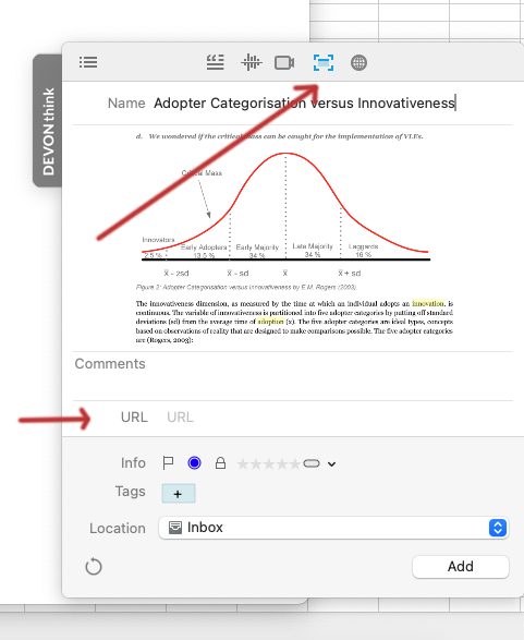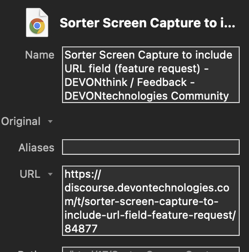 Some other file-management apps have a built-in browser plugin that automatically preserves the page title and URL source as you take your screenshots. With Sorter, you need to do all that manually, but even then, there is no URL field to fill in upon saving. So, your workflow goes like this: take a screenshot → save it → open DT → spot it → add URL. My suggestion is to make it at least two steps more efficient: take a screenshot → add URL → save it.