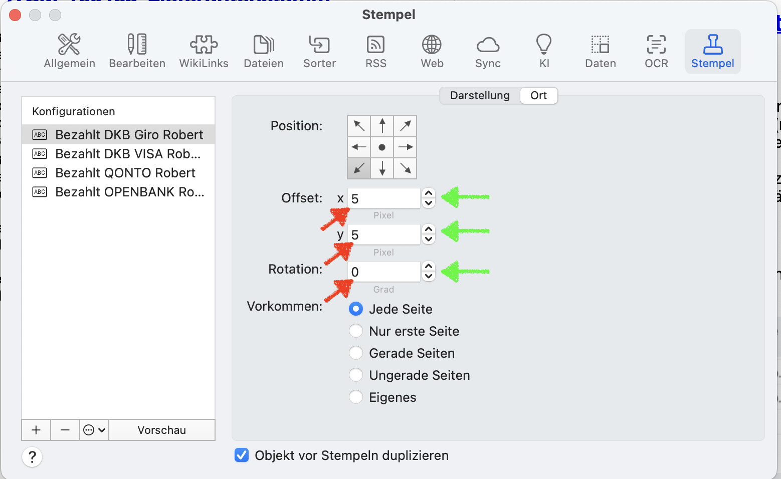 I found that the way the preferences on the stamp position/rotation are set is not consistent: when i type the position in the number field (red), it will not be saved when leaving the preferences and coming back. to make the change be persistent, I have to klick the arrow buttons (green) to dial the position.