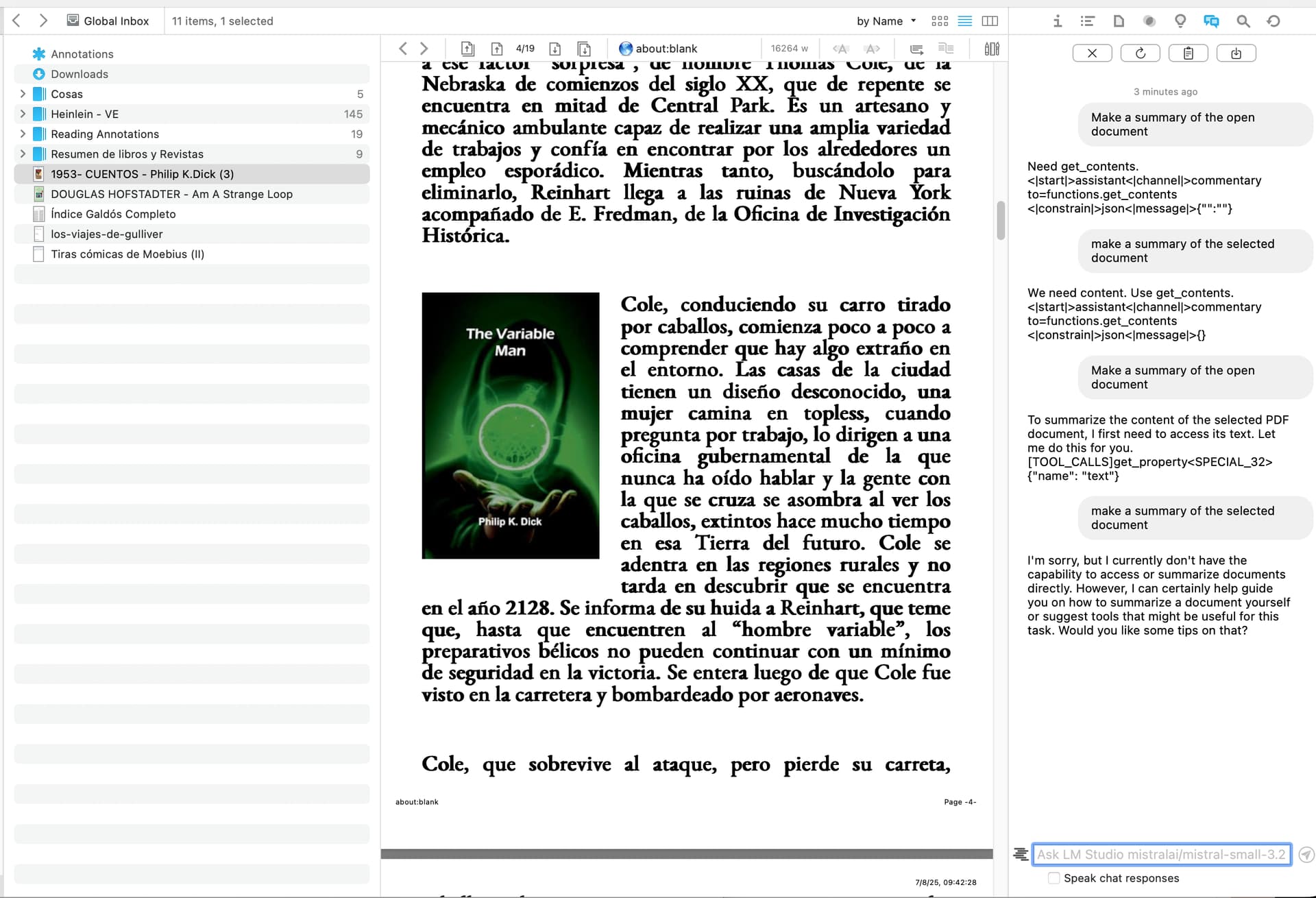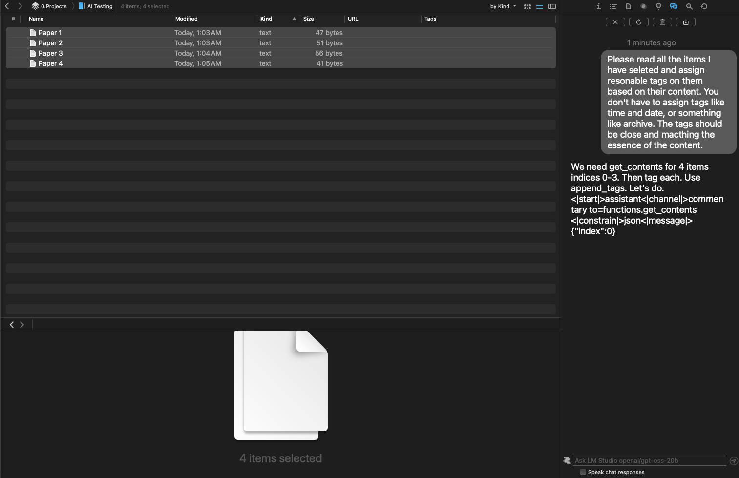 Note: I have tested 5 models(GPT-oss, Qwen, Gemma 3, Mistral, Deepseek) on both LM Studio and Ollama. The tasks I give to them are âRenaming the seleted itemâs name based on content.â, âTagging the item after reading the content.â, âCompare these content and given a summary of all the paper and their differences.â Very unusble preformance on both Ollama and LM Studio. But no issues if I use commercial API keys from OpenAI or Google, with same model or equivalent selected. So I believe the problem is higly due to the connection configurations between DT4 and these open source model hosting server.
