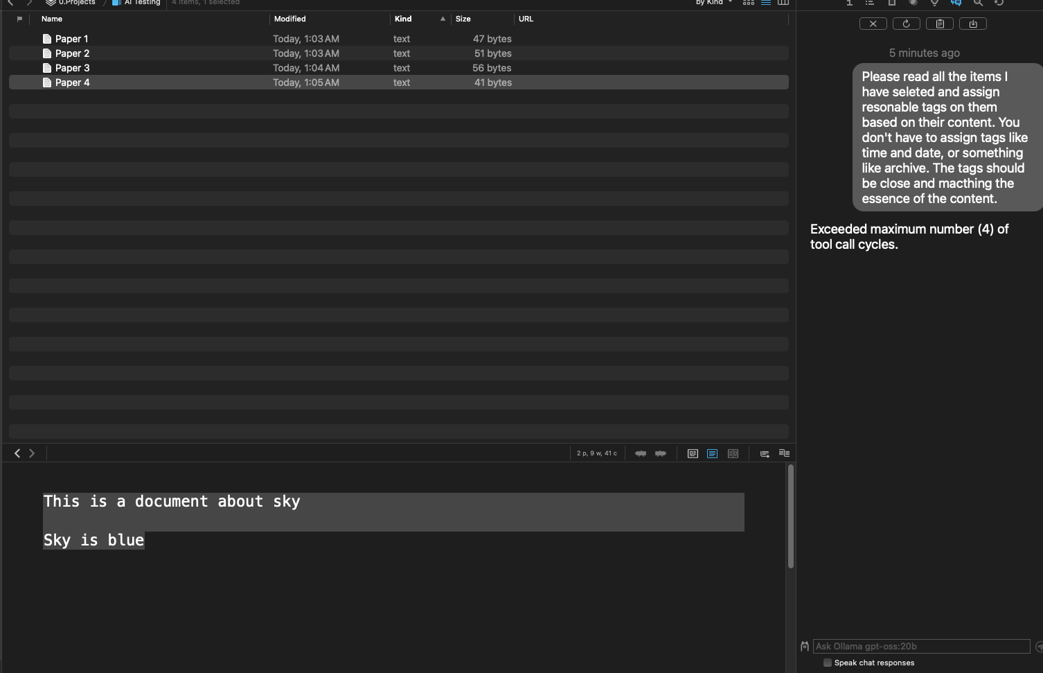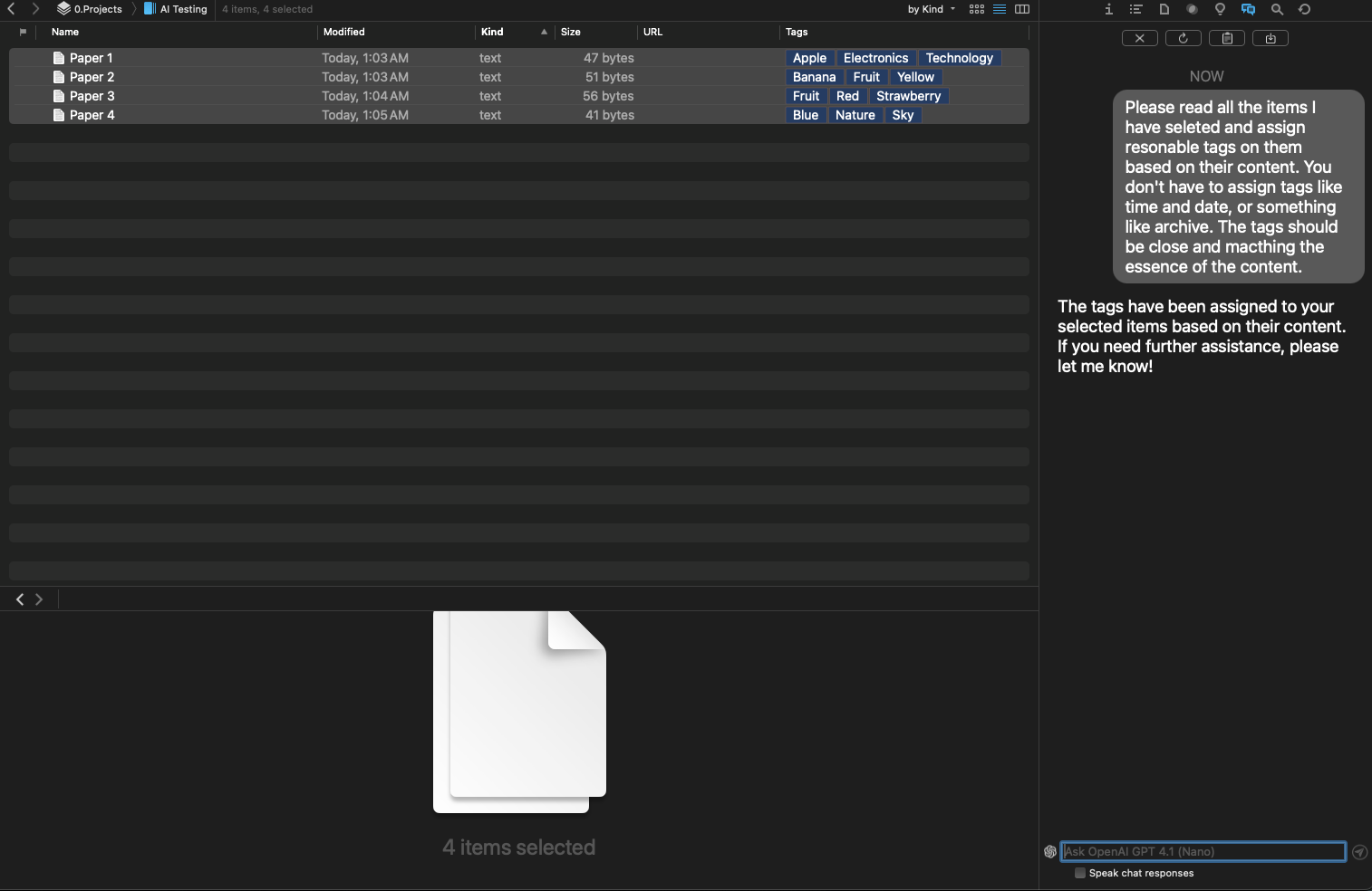The prompt of the task is the same across all the following tests:âPlease read all the items I have seleted and assign resonable tags on them based on their content. You donât have to assign tags like time and date, or something like archive. The tags should be close and macthing the essence of the content.â