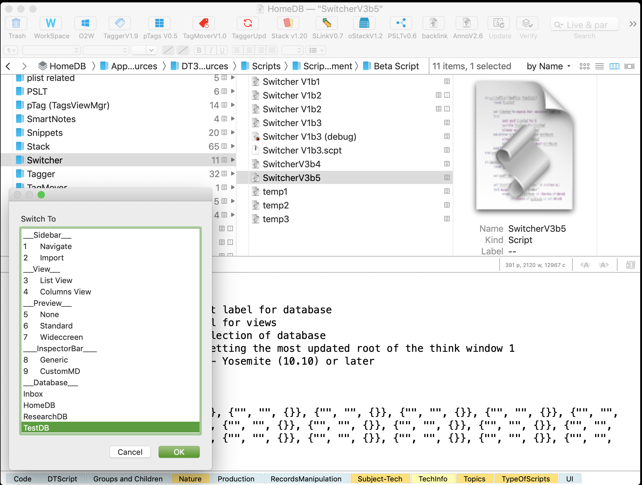 The script uses a popup list to switch between sidebar, view, preview, inspector bar, and database. The script will retain the latest context of an opened database (selected document, group, or search results) in each opened main window when user begins to use the script to switch among databases in main windows. Maximum of 5 opened main windows and 20 opened databases.
