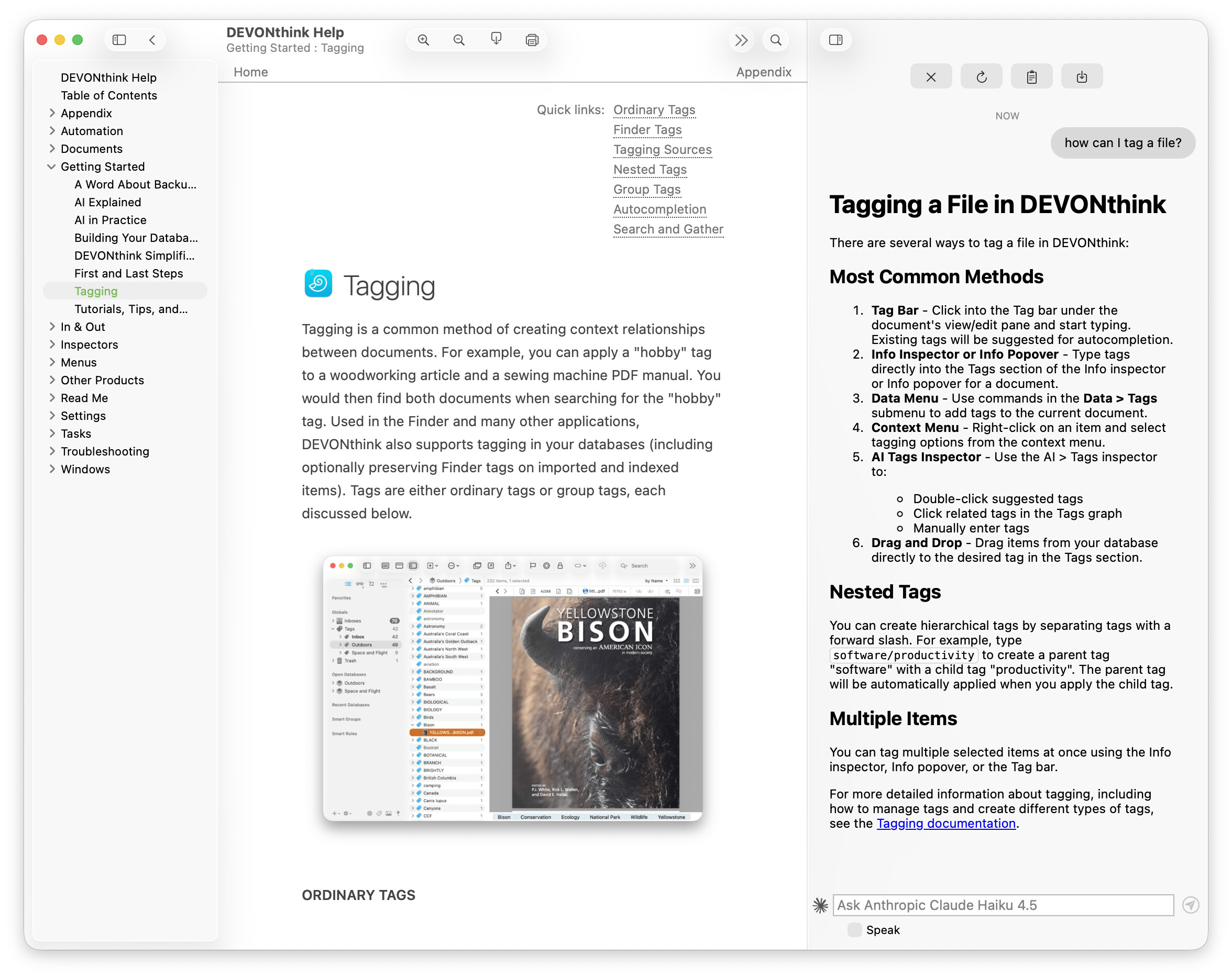 PS: If you want to use AI, you’ll need to set it up in DEVONthink’s Settings > AI > Chat. Then you can use the Help assistant, like so (noting AI gave me a link to jump to the page shown)…