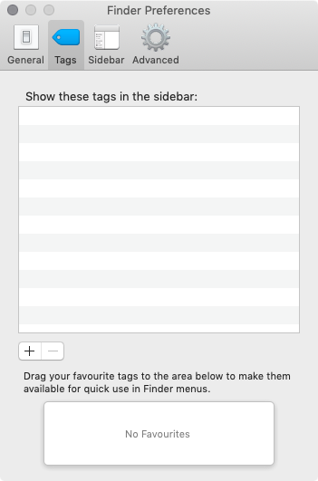 … And I’ve just discovered, as I don’t use Finder tags, I can’t delete them from the Finder Pretences and I don’t think that secret disabling preference worked for me as I got no feedback from choosing the link option and the terminal code just gave me an error.