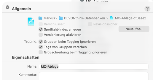 Am Wochenende musste ich jetzt mein MacBook neu aufsetzen. Der Import der verschiedenen DEVONthink Datenbanken hat einwandfrei geklappt. Jetzt stelle ich allerdings fest, dass meine Tags, sobald ich ein Dokument markiere, verschwinden. Zumindest scheint es bei denen zu sein, die über Hazel hinzugefügt wurden. Alle die, die ich schon fest in DEVONthink hinterlegt habe, werden nicht gelöscht (also z.B. das Jahr, verschiedene Bank etc.)
