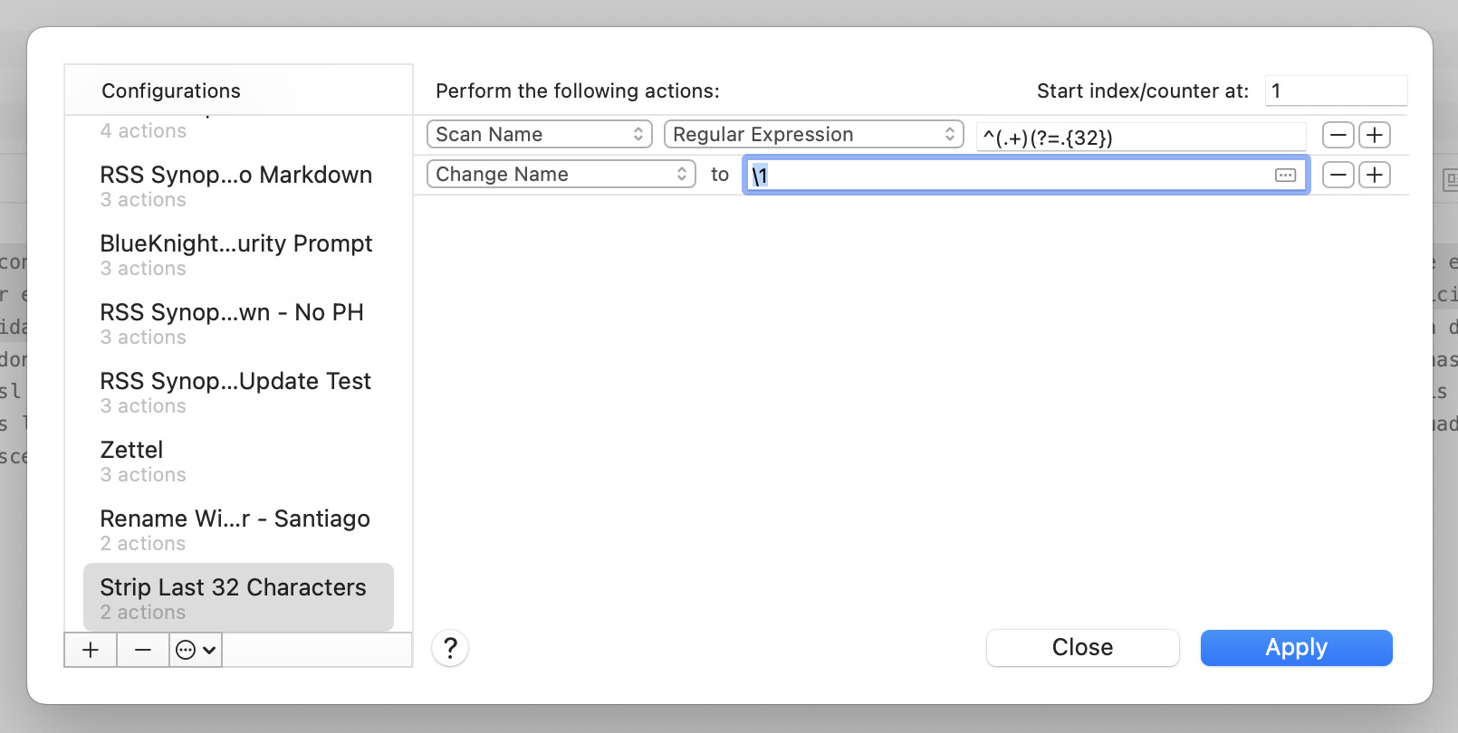 Hi folks! I recently exported all of my data out of Notion and converted the files into PDF using a utility. The Notion export tacked on a 32 character global ID to all of my filenames. Is there anyway I can write a smart rule that will truncate the last 32 characters from the filename? Thanks so much.
