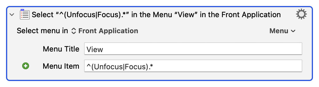 Itâs going to select a menu item that starts with either the âUnfocusâ or âFocusâ + optional stuff, if any (.*) from the âViewâ menu.