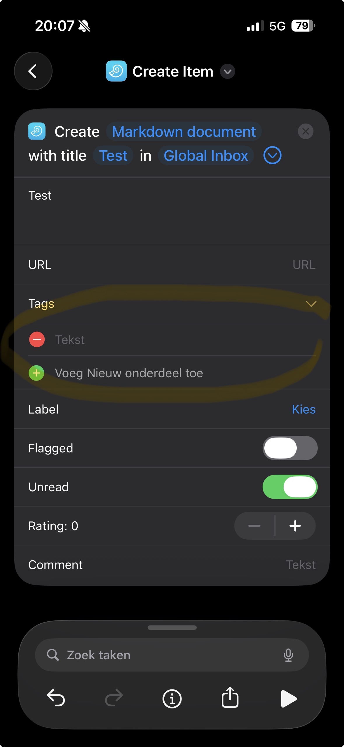 When I try to create a basic shortcut with only the Create Item action in iOS shortcuts I cannot enter a tag in the tags field. The text I enter gets deleted immediately after typing (even before “leaving” the field). Also, if I try to insert a variable in this field, it does not show.