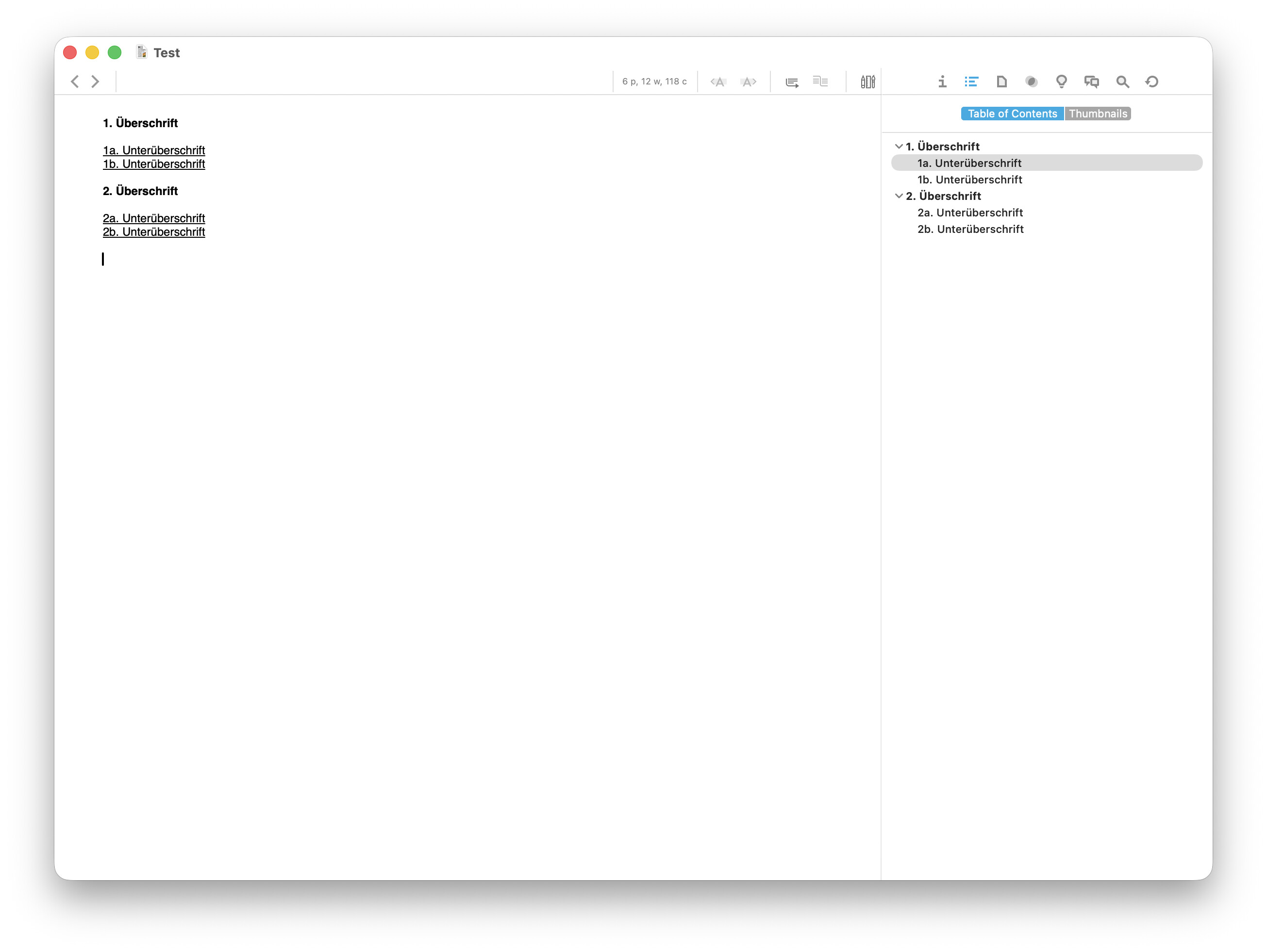 RTF ist nicht semantisch, besser gesagt, die vorhandenen Werkzeuge unterstützen RTF-Fähigkeiten, die in diese Richtung gehen, nicht. Dh eigentlich könnte RTF so etwas wie Stilvorlagen, so dass du dir welche für “Überschrift”, “Unterüberschrift” usw. definieren und dann so ausgezeichnete Absätze in ein Inhaltsverzeichnis übernehmen könntest. Aber, wie gesagt: Die vorhandenen Tools unterstützen das in der Regel nicht.