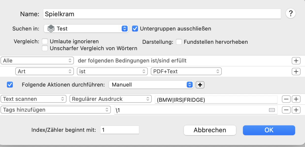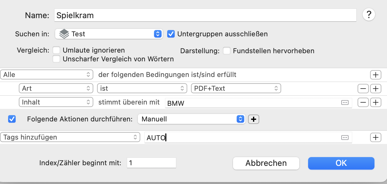 Can someone point me in the right direction. I would lik DT to scan all my pdf files and apply tags that I designate such as: AUTO, TAXES, HOME, etc based on set criteria like 1 - does the pdf contain BMW then attach AUTO tag, etc. Thank you.