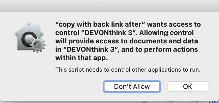 Does anyone have any advice about how to give the script access control within the script so I don’t have to keep Allowing Control every time? (see immediate previous comment). I can’t figure out how to do this. This pop-up does not come up when I just run the script from within DT3. However, to assign a keyboard shortcut, I have to make it an application to turn it into a service, and when I do that and activate the keyboard shortcut, the pop-up appears asking to Allow Control each time.