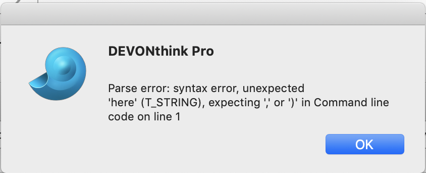 Sorry, I meant my applescripts in DT3. I turned out to be trivial though. I am not able to run the script on special characters at all in the new account. It works fine with no special characters, but otherwise, I get this error (when trying to run the script on the text ’ Testing “here is some text” '): “Parse error: syntax error, unexpected ‘here’ (T_STRING), expecting ‘,’ or ‘)’ in Command line code on line 1”.