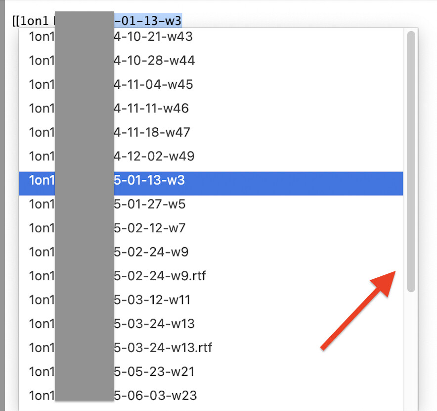 So in some rtf note I’m typing text and then I add `[[1on1` ,for example , and a list of multiple notes that starts with “1on1” pop up. If I click down arrow to select some note in the list it will just autocomplete with the first note in the list.