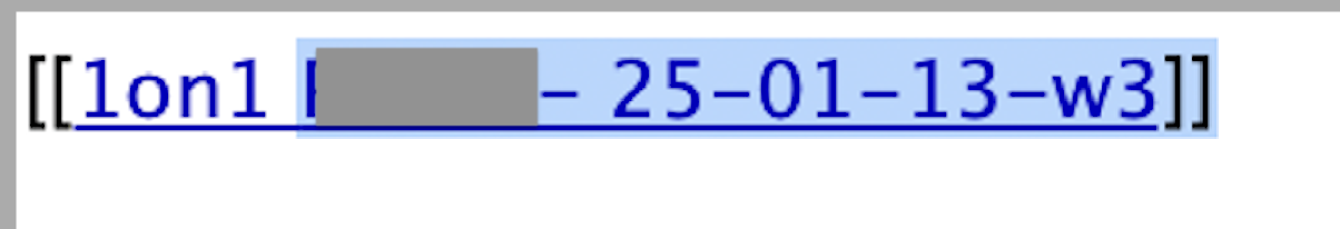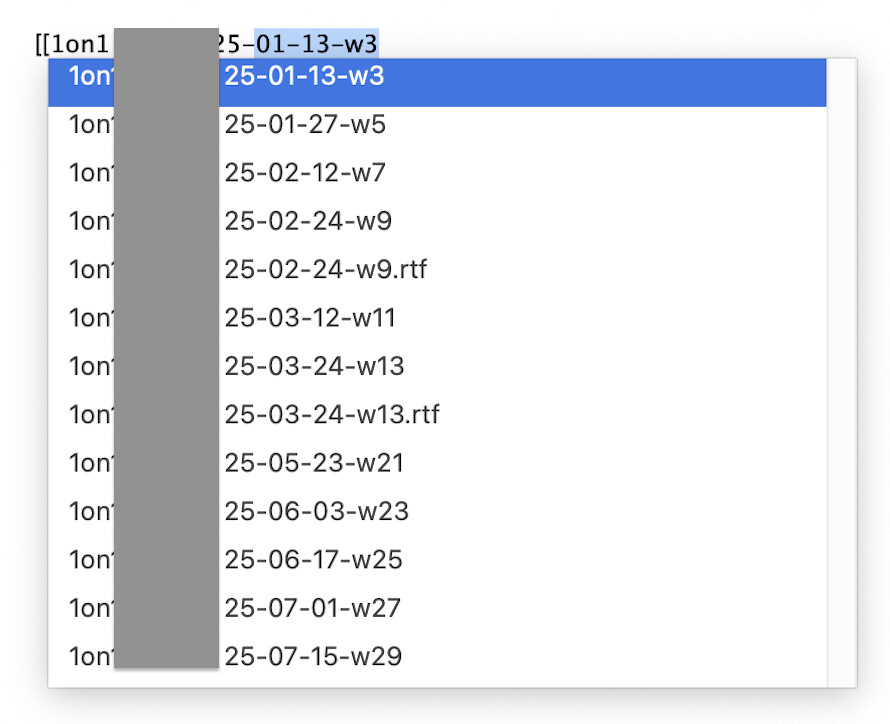 Then if I type [[1on1 and then press Space or Up / Down arrow it autocompletes with some of files in the long list presented … interesting it’s not either the first or last file in the list.