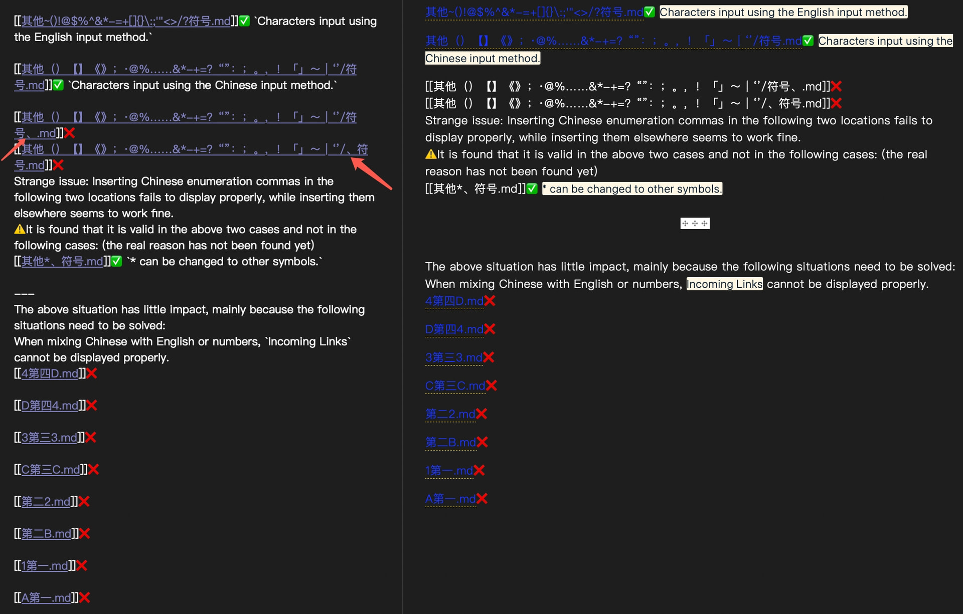 In addition, those two special cases (Indicated by the red arrow in the first picture) can also be displayed normally after clicking WikiLinks to create a new file today.