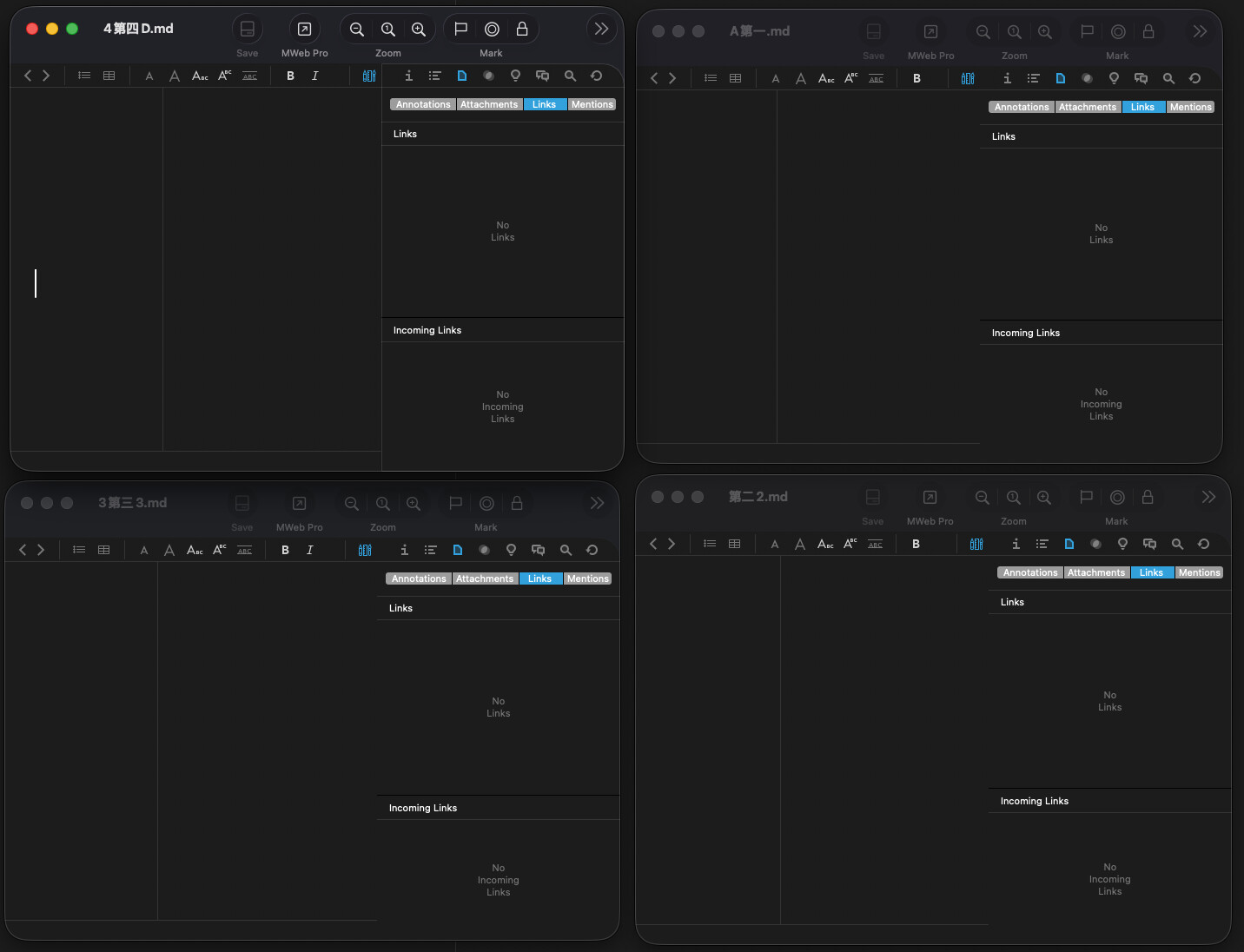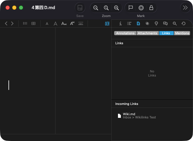 When mixing Chinese with English or numbers, the Incoming Links in Inspectors shows nothing. It is reflected in the lower half of the picture.