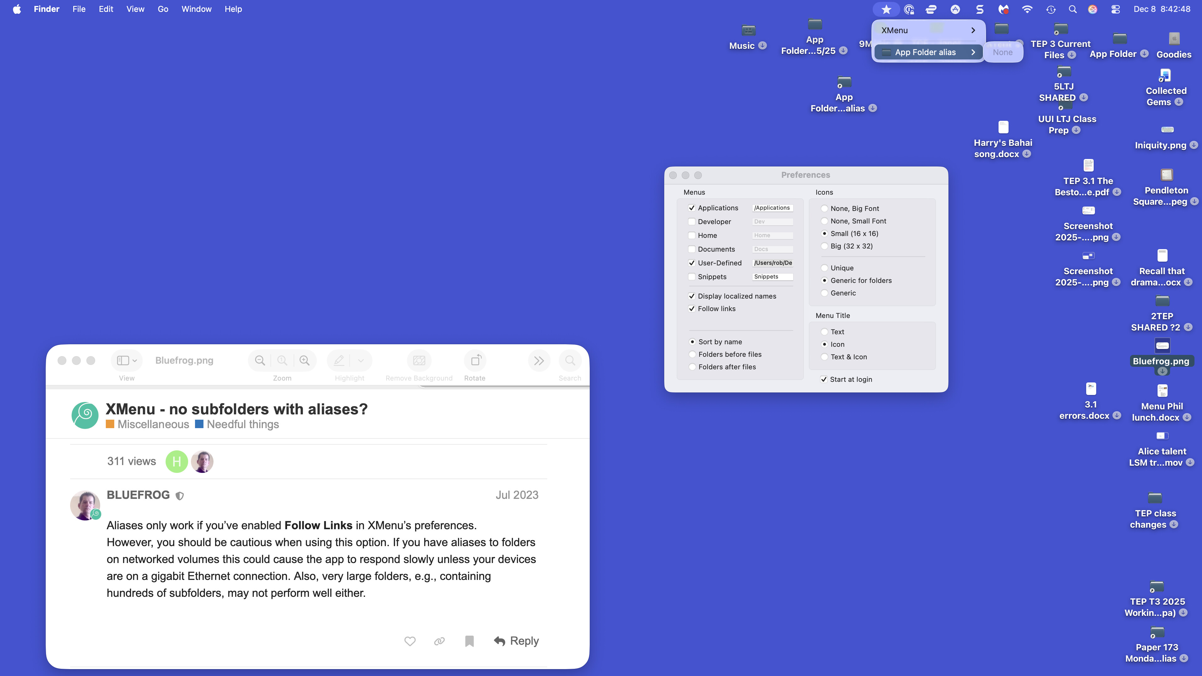 Using an alias in the “user defined” menu item still does not allow a normal hierarchy display of contacts. I just get “none”. So my question remains how can I get a menu hierarchy using XMenu for a folder on my “desktop” that is shared across several CPU machines on iCloud. If I put the folder into a xMenu library, it disappears from the desktop and is no longer shared. If I try and use an alias, no hierarchy is created. Is there a solution?