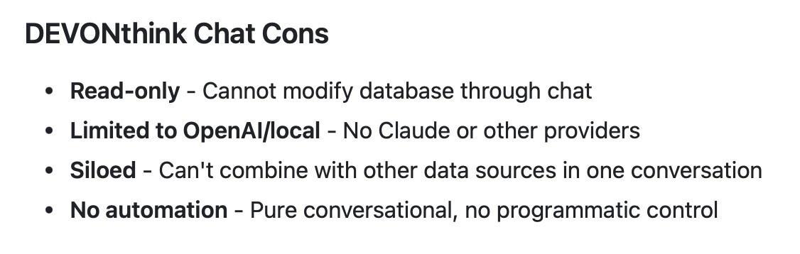 Hey folks, I built a small MCP server for DT that I’ve been using locally. Yes I know there are others but I wanted to implement my take on how to deal with private data - the server implement options for replacing sensitive data with an anonymized string still allowing meaningful searches. There is also an option to exclude an entire database(s) from the search entirely. It is not perfect but may go a long way to address your privacy concerns.